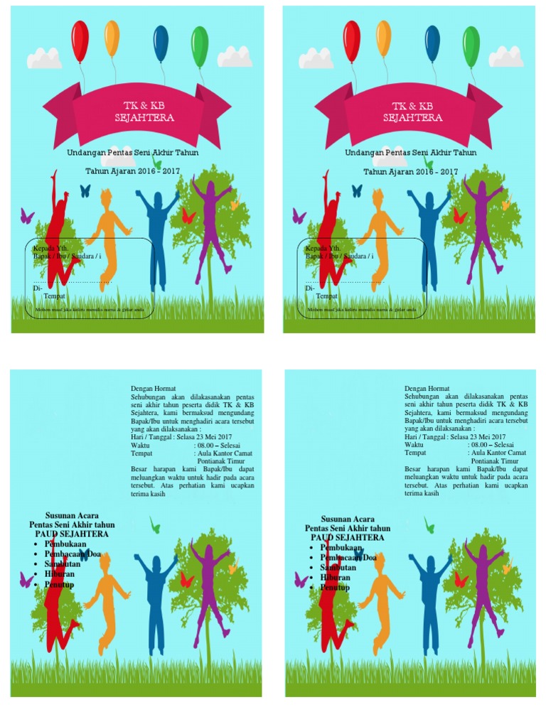 Yuk simak contoh undangan perpisahan tk.docx Ada 10 halaman contoh undangan perpisahan tk ukuran A4 1.8MB. Pertama-tama marilah kita panjatkan rasa syukur kehadirat Allah SWT yang mana atas rahmatNya lah di hari yang bahagia ini kita bisa hadir dalam acara perpisahan TK Insan Mulia. Contoh undangan perpisahan tk terbaru 2019 secercah ilmu. contoh surat resmi undangan perpisahan sekolah dasar. surat resmi tentang perpisahan sekolah surasm Lihat juga soal tentang undangan serta ulang lagi materi contoh undangan perpisahan tk Ketemu lagi nih sob pada kesempatan kali ini kami akan membagikan informasi bermanfaat seputar Kumpulan tema acara yang menarik.